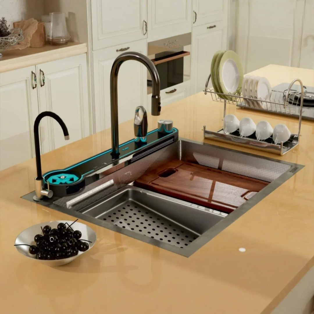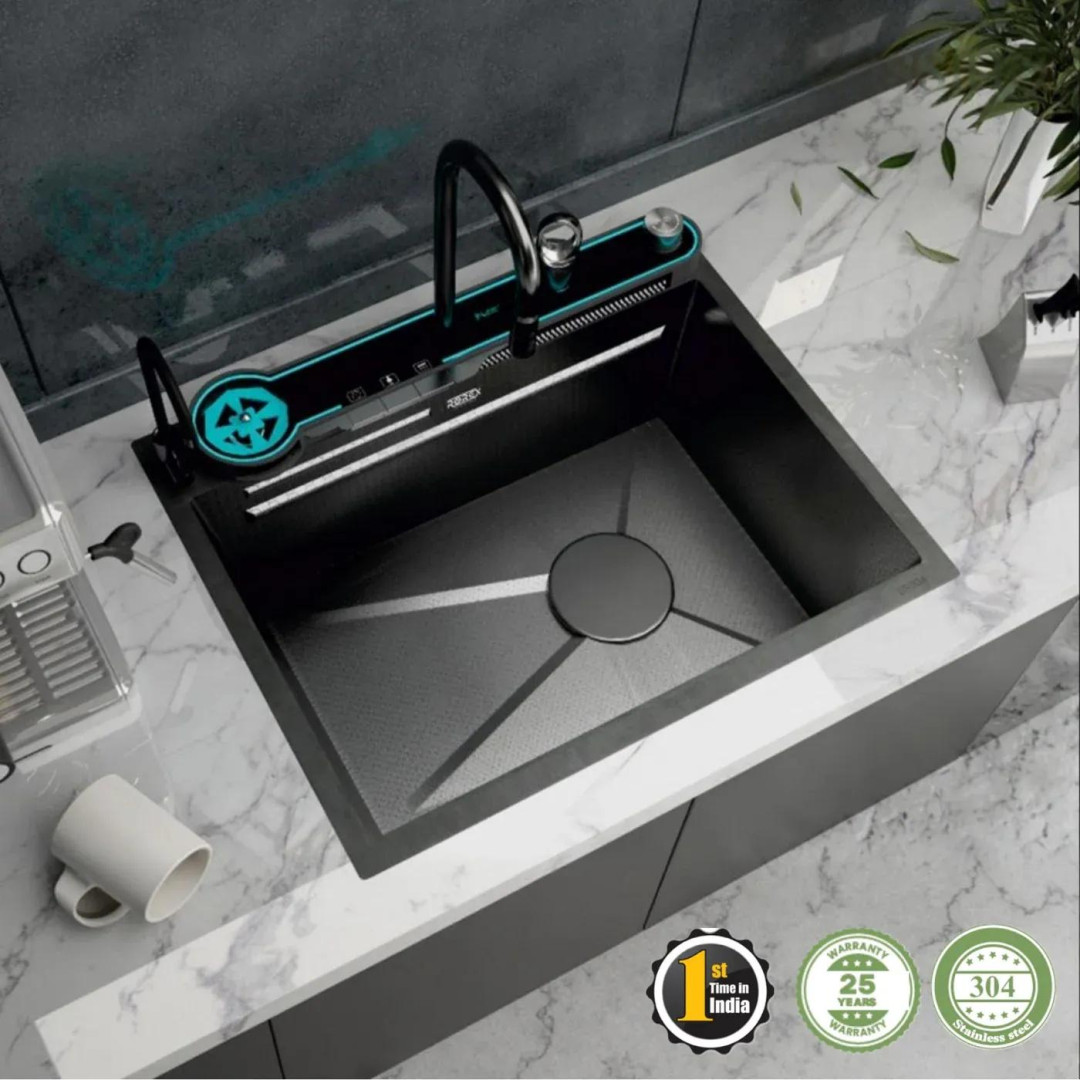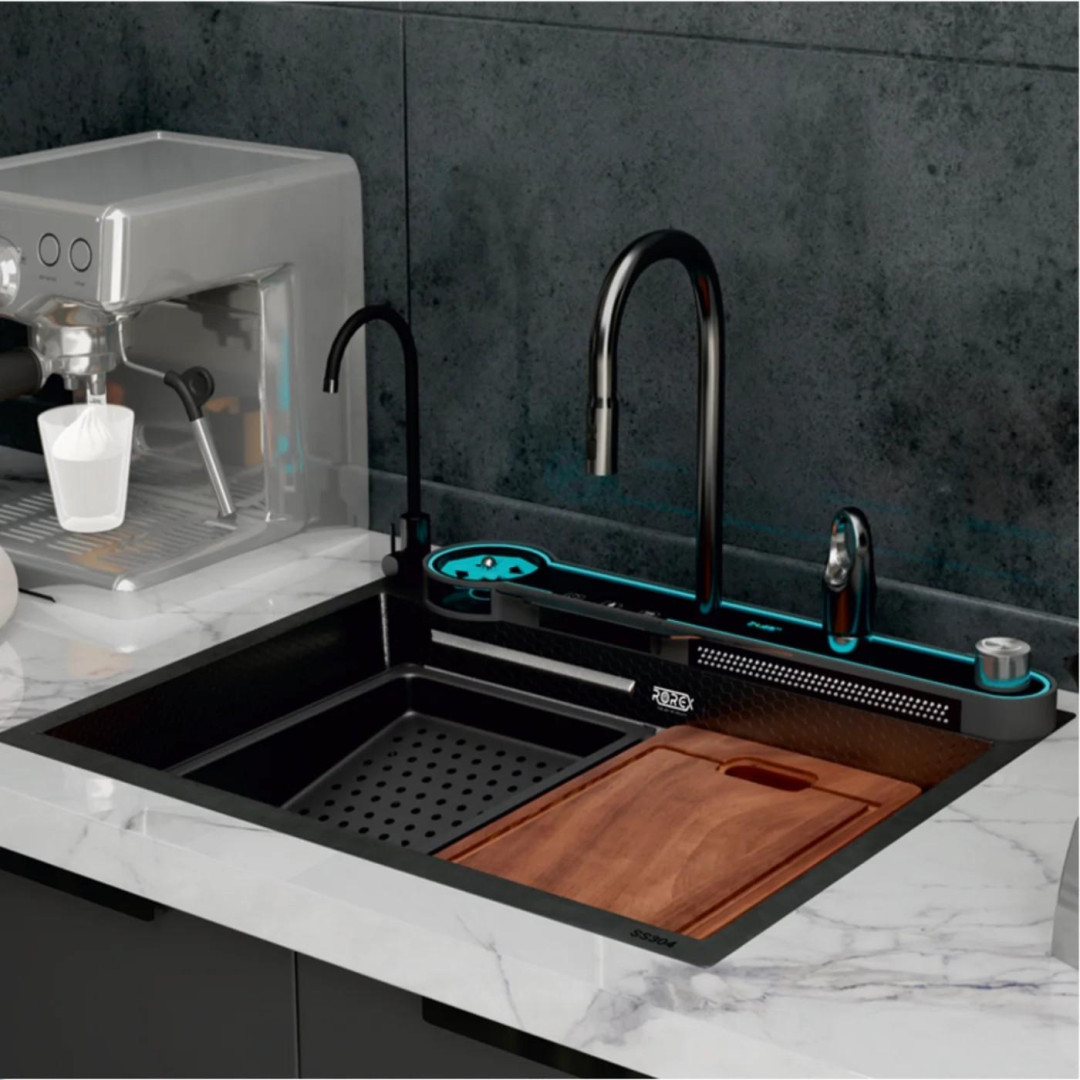 CONTROL KNOB: Sleek black knob offers effortless control over water flow for both the horizontal waterfall outlet and multifunctional pull-out tap, including hot/cold mixing.
