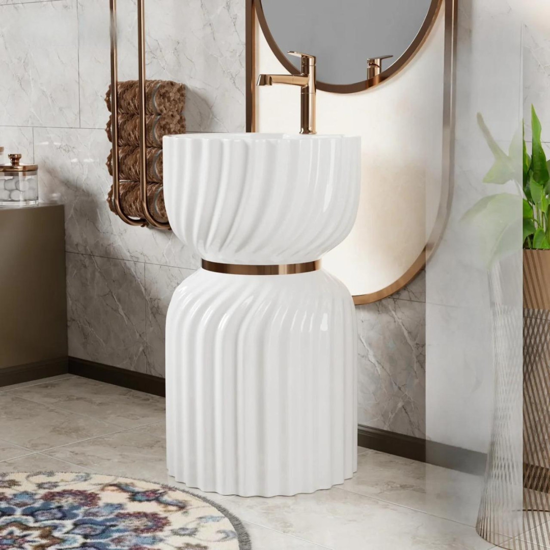 Details: Introducing our Pedestal Free Standing Wash Basin - a perfect blend of elegance and functionality, designed to elevate your bathroom's aesthetic while ensuring unparalleled convenience. Crafted with precision and innovation, this wash basin promises to be the centerpiece of your bathroom space. Constructed from high-quality Materials, this Pedestal basin boasts exceptional durability and resilience, ensuring it stands the test of time. Its smooth, non-porous surface not only exudes a luxurious sheen but also makes cleaning a breeze, allowing you to maintain its pristine appearance effortlessly. The free-standing design offers flexibility in placement, allowing you to position it wherever it suits your bathroom layout best. Its pedestal base not only adds stability but also conceals plumbing, maintaining a sleek and minimalist appearance. The generously sized basin provides ample space for daily washing rituals, accommodating all your needs comfortably. Whether it's a quick morning splash or a leisurely evening cleanse, this round wash basin makes every moment in front of the mirror a pleasure. The timeless and versatile design seamlessly integrates with various bathroom styles, from modern to traditional, making it a versatile addition to any decor. Its neutral white finish complements any color scheme, allowing you to play with accessories and decor to create your desired ambiance. Installing this Free standing basin is a hassle-free experience, thanks to its user-friendly design and comprehensive installation instructions. Its compatibility with standard plumbing ensures a smooth transition from your old sink. Invest in the Ceramic Pedestal Wash Basin today, and indulge in the luxury of a well-designed bathroom. Elevate your space with a touch of sophistication and convenience, setting the stage for a revitalizing bathing experience. Order now and experience the epitome of form and function in your bathroom.Package Dimensions: 39.0 x 18.9 x 18.9 inches
