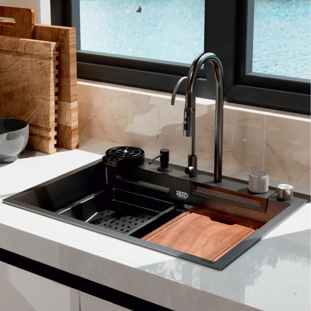 CONTROL KNOB: Sleek black knob offers effortless control over water flow for both the horizontal waterfall outlet and multifunctional pull-out tap, including hot/cold mixing.